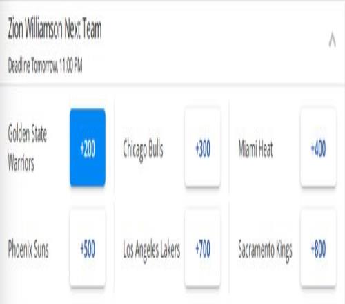 北京时间1月18日,锡安最新下家赔率出炉,勇士高居首位,他们成为了这位鹈鹕球星的头号热门下家。锡安下家赔率目前排在第1-6位的依次是勇士、公牛、热火、太阳、湖人和国王。随后美记James Piercey晒出了一份4换1的交易方案,认为这是双赢的选择。