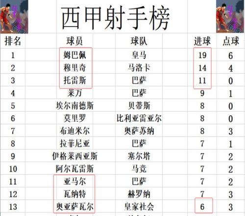 射手榜方面,姆巴佩19球领跑,穆里奇14球紧随其后,托雷斯今天首发未能进球,还是11球排在第3。莱万替补登场同样没有进球,9球排在第4。奥亚萨瓦尔打入一球,还差1球才能挤入前十。