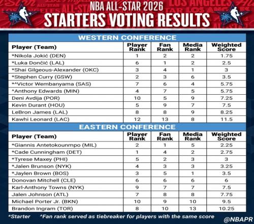 据统计,杰伦·布朗在球迷投票中排名东部第5,球员投票中排名第3,媒体投票中排名东部第1,最终排名东部第5(权重为3.5)!