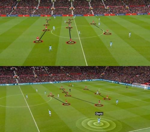 在进攻端,卡里克和教练组安排的无锋阵容,通过不断的换位跑动,利用曼城中场和后卫身后的区域。站在中锋位置的姆贝莫回撤,B费、阿马德·迪亚洛 、帕特里克·多古甚至边卫迪奥古·达洛系统的跑位,不断制造出空当。