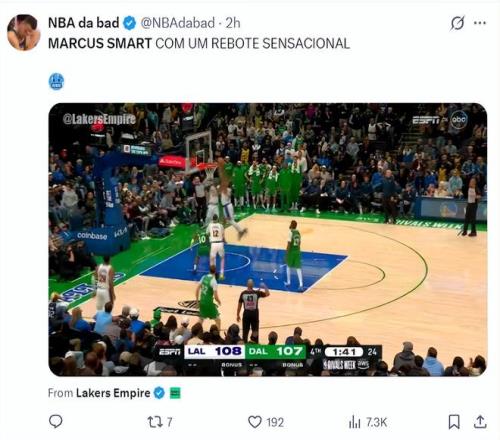 随后在詹姆斯上篮偏出时斯玛特从天而降完成补篮,这一球后湖人再度领先到3分,末节斯玛特拿到7分4篮板1助攻1盖帽(5中2+罚球5中3)。