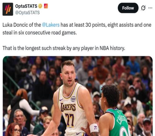 凭借这样的表现,东契奇已经连续6个客场至少轰下30分8助1抢断,创造历史NBA最长纪录。