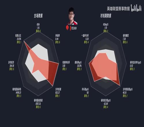 BLG上单Bin对线期数据:KDA、场均镀层、场均击杀参与、场均经济差、补兵差、推线率、一血参与率全部排名第一;分均伤害排名第3.