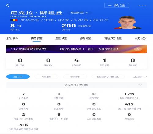 去年夏天他以自由身从达马克加盟热那亚,这是他生涯首次效力五大联赛球队,截止目前出场7次打入1球。此前据迪马济奥报道,热那亚与斯坦丘完成解约,球员已恢复自由身。