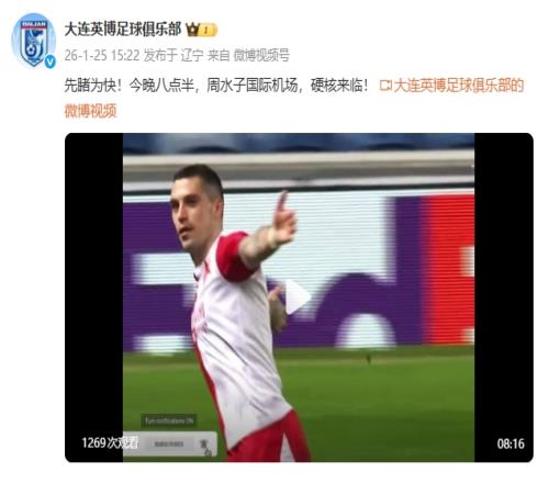 体育播报01月25日宣 大连英博官博发布斯坦丘集锦——“先睹为快!今晚八点半,周水子国际机场,硬核来临!”