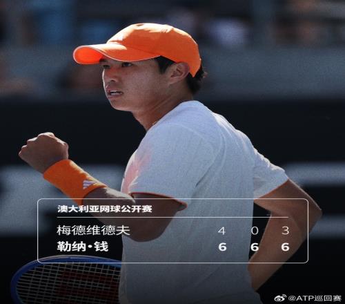 体育播报01月25日宣 2026澳网男单第4轮,25号种子勒纳·钱对阵11号种子、三届赛会亚军梅德韦杰夫,经过3盘较量,勒纳·钱3-0横扫梅德韦杰夫,晋级澳网男单8强。