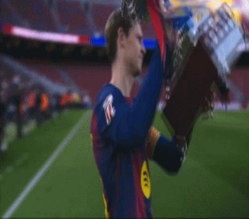 赛前,德容向球迷展示西超杯冠军奖杯