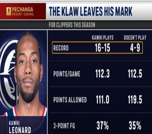 据统计,在伦纳德出战的比赛中,快船战绩16胜15负,场均得分112.3分,场均失分111.0分,球队三分命中率37%;
