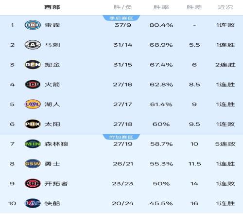 截至发稿西部的排位,5-10:湖人、太阳、森林狼、勇士、开拓者和快船