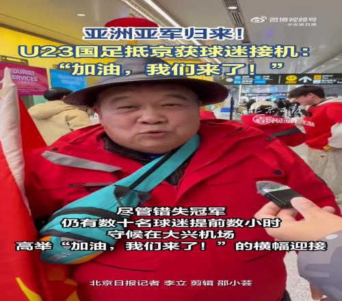 体育播报01月26日宣 刚刚夺得U23亚洲杯亚军的中国队已经抵达北京,据北京日报现场直播报道,数十名球迷提前数小时守候在大兴机场,高举“加油,我们来了!”的横幅迎接。