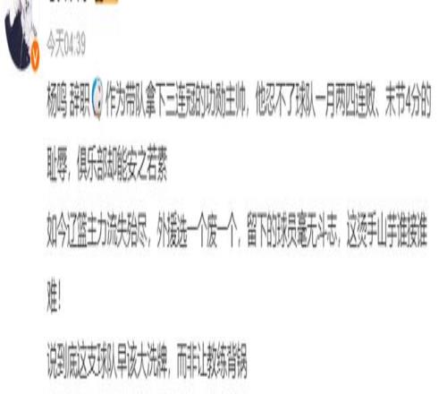 还有更多的大V觉得,辽篮主力流失殆尽,外援选一个废一个,这支辽篮早该大洗牌了而非让杨鸣背锅。