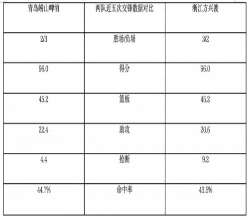 青岛崂山啤酒在与浙江方兴渡的历史交锋中处于下风,上赛季常规赛两战皆负,季后赛5次交手,青岛崂山啤酒2胜3负。