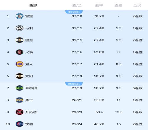 由于湖人昨日击败独行侠取胜,因此湖人和太阳之间的胜场差拉开一个胜场,湖人继续排名西部第五。