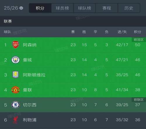 本赛季英超前六相互交锋积分榜