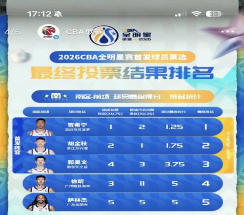 历经球迷朋友们21天的踊跃投票,综合媒体代表的投票结果,2026CBA全明星赛首发名单正式出炉!贺希宁成功入选南区首发阵容,感谢每一位投出宝贵一票的球迷和媒体老师。