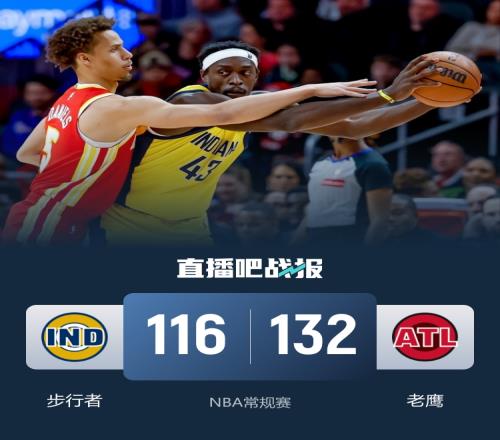 上半场,双方开场大打对攻,步行者轮番冲击内线频频得手,麦科勒姆和亚历山大-沃克相继飙中三分迅速回应,次节两队命中率均有下降,步行者持续发力打出14-3的攻击波获得两位数优势,麦科勒姆连中三分止血,半场战罢步行者64-60领先老鹰。下半场,西亚卡姆突然发力,连投带罚单节砍下17分,但老鹰多点开花轰出17-0的攻击波一举取得两位数优势,步行者后劲不足,老鹰稳扎稳打将优势保持到最后。最终,老鹰132-116击败步行者,主场过关。