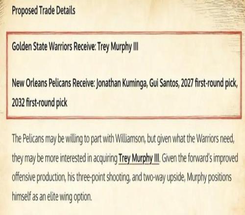 那么勇士有什么办法能够得到墨菲呢?美媒《Fadeaway World》提出了一套4换1的交易方案,建议勇士将库明加、桑托斯以及2027年、2032年的首轮签打包送到鹈鹕,换回墨菲。