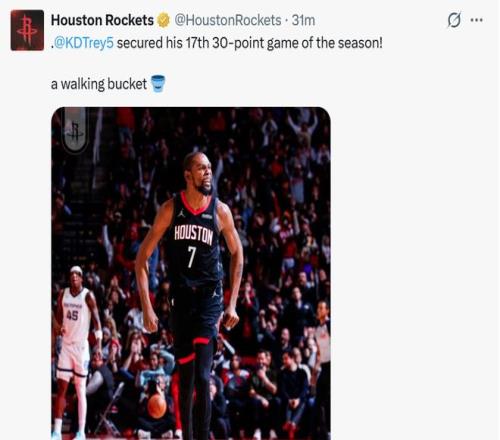 火箭逆转擒灰熊!申京17投15中轰33+9+6杜兰特33+8JJJ17+7