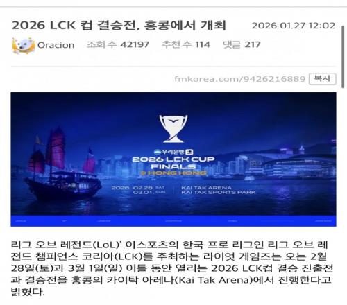 体育播报1月27日宣 今日韩媒发文透露2026第一赛段的LCK CUP总决赛落地中国香港!这个消息引起了韩网粉丝的讨论;