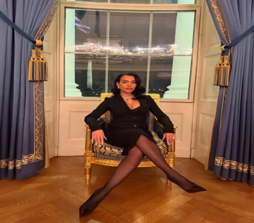 这位31岁的模特兼社交媒体名人,身着剪裁利落的黑色西装式连衣裙,搭配精致的妆容和光滑、带有复古风情的波浪卷发。一张照片中,她置身于白宫一个装饰华丽的房间中央,坐在一把镶金边的椅子上,背景是蓝色帷幔和拼花地板,营造出庄重而近乎电影感的画面。