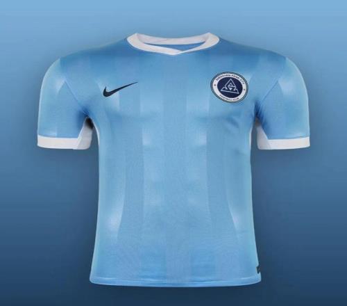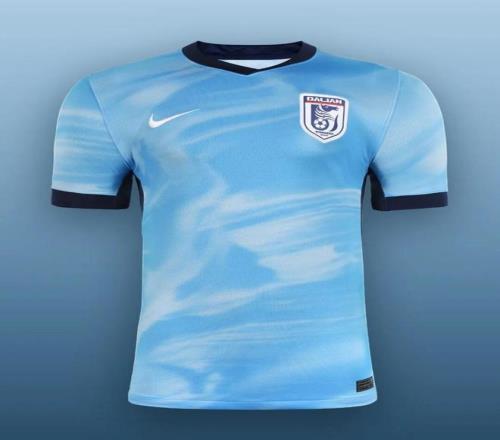 大连英博以天蓝色为主色调,搭配白色元素,将骏马意象转化为贯穿整体的动感线条。领口与袖口采用撞色设计,搭配深蓝包边。体现速度、力量与持续向前的气势。