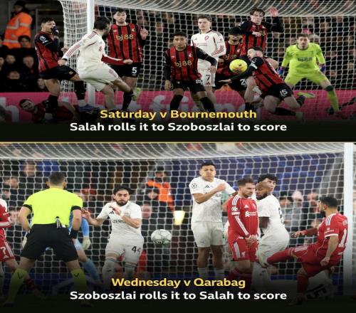 欧冠联赛阶段第8轮,利物浦主场对阵卡拉巴赫,下半场索博斯洛伊助攻萨拉赫破门,两人连续两场比赛通过战术任意球...