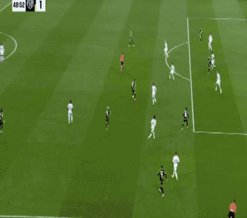 第15分钟,皇马打出快速反击,维尼修斯沿着左路进入禁区,以一敌三,兜射远角,打破僵局。